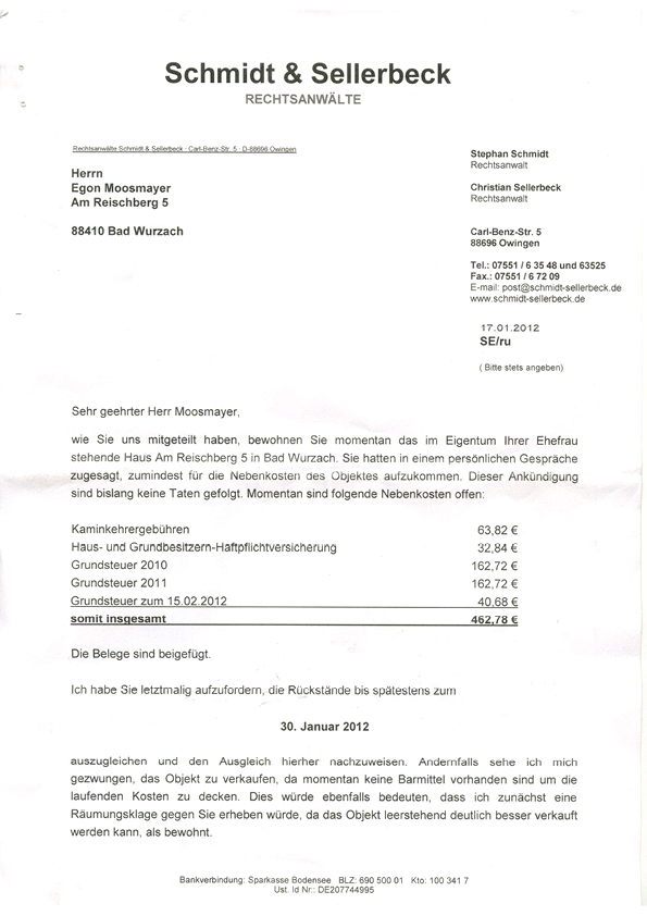 Der rechtliche Betreuer Christian Sellerbeck fordert den Ehegatten Egon auf, bereits bezahlte Rechnungen noch ein zu bezahlen.