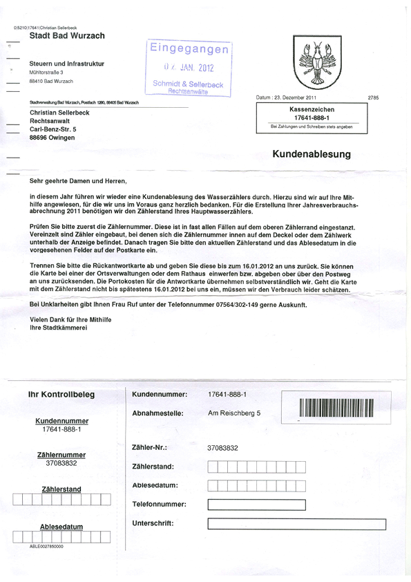 An den Ehegatten Egon Moosmayer erst nach Ablauf der Ablesefrist mit Schreiben vom 17.01.2012 übersandt