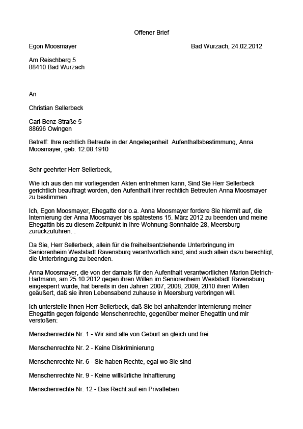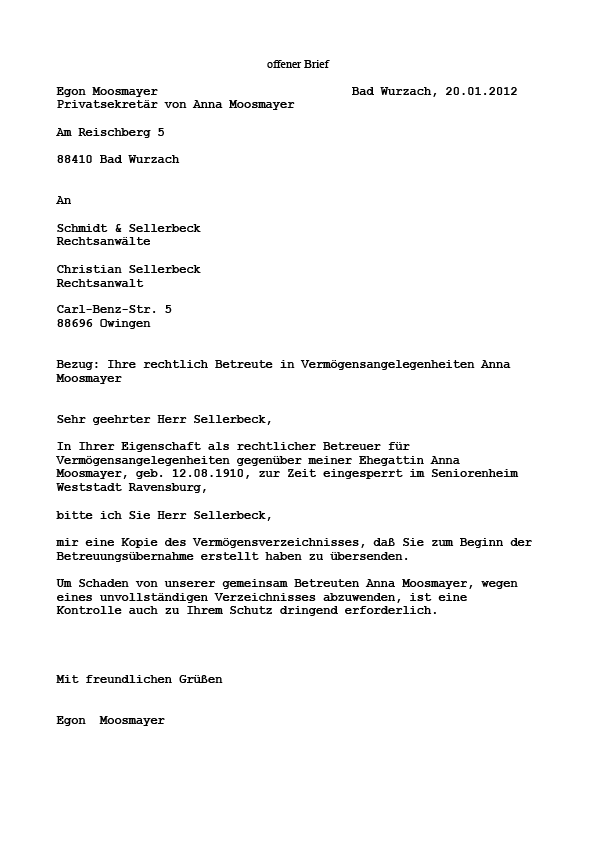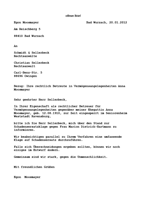 Desweiteren führt Egon Moosmayer an, daß der rechtliche Betreuer Christian Sellerbeck durch seine unwahren Behauptungen nicht fähig ist, die rechliche Betreuung seiner Ehegattin Anna Moosmayer zu führen.