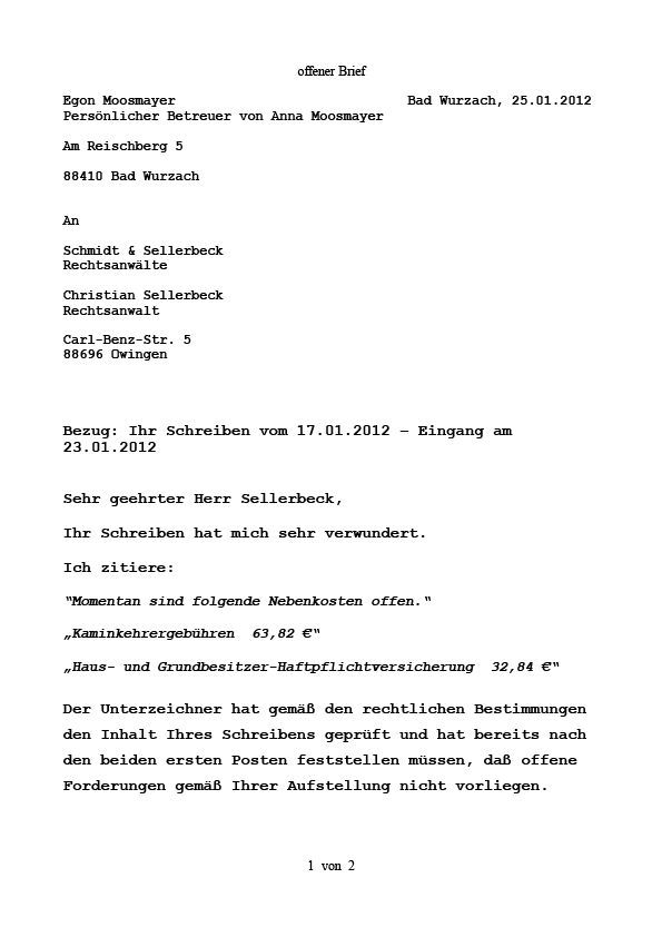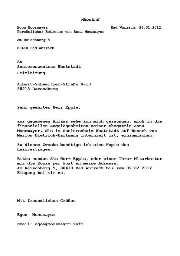 Egon Moosmayer, persönlicher Betreuer von Anna Moosmayer antwortet auf den Brief vom 17.01.2012