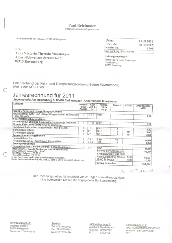bereits bezahlte Kaminkehrer-Rechnung