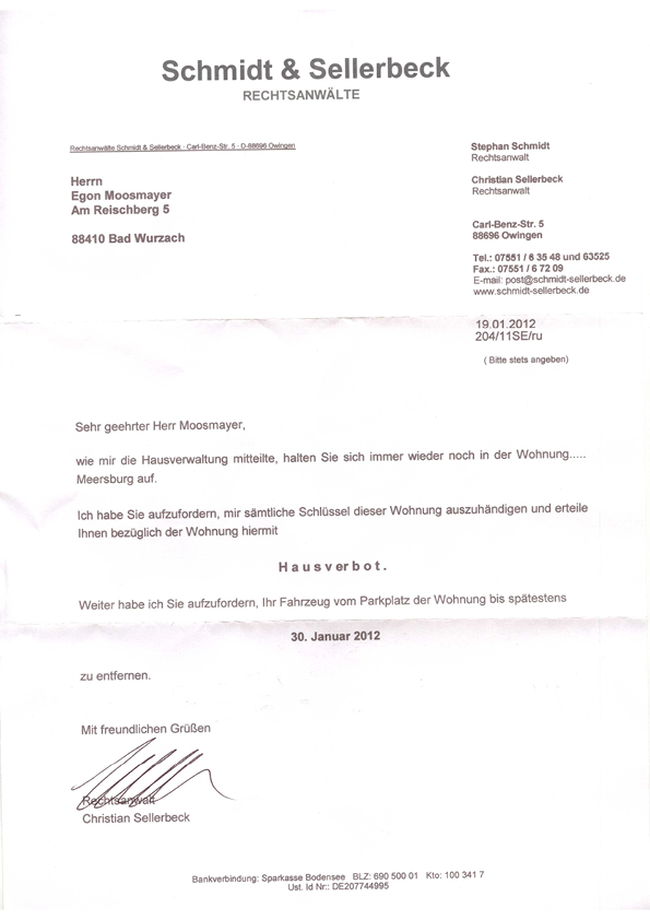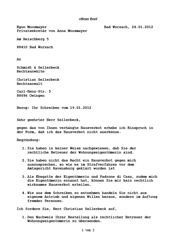 Der Ehegatte Egon Moosmayer antwortet auf das "Hausverbot" vom 19.01.2012
