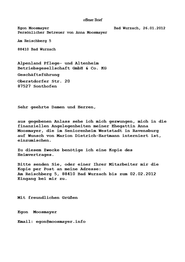 Alpenland Pflege- und Altenheim Betriebsgesellschaft in Sonthofen und bittet um eine Kopie des Heimvertrages
