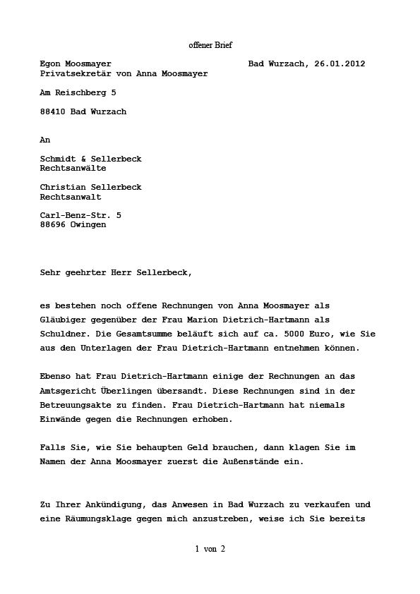 Egon Moosmayer, persönlicher Betreuer von Anna Moosmayer antwortet auf den Brief vom 17.01.2012