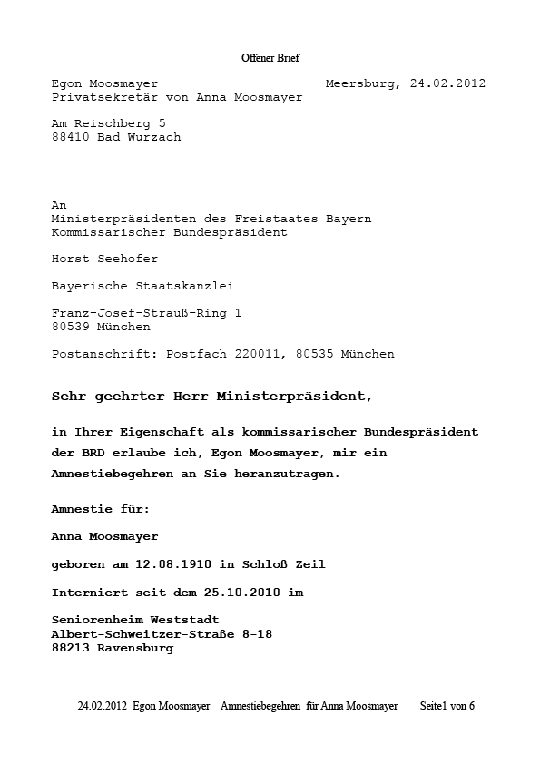 Egon Moosmayer schreibt an den amtierenden Bundespräsidenten ein Amnestiebegehren für Freilassung seiner Ehegattin